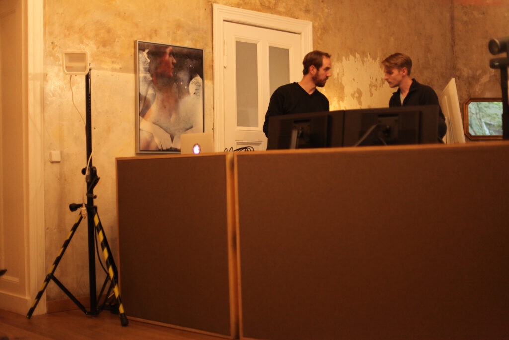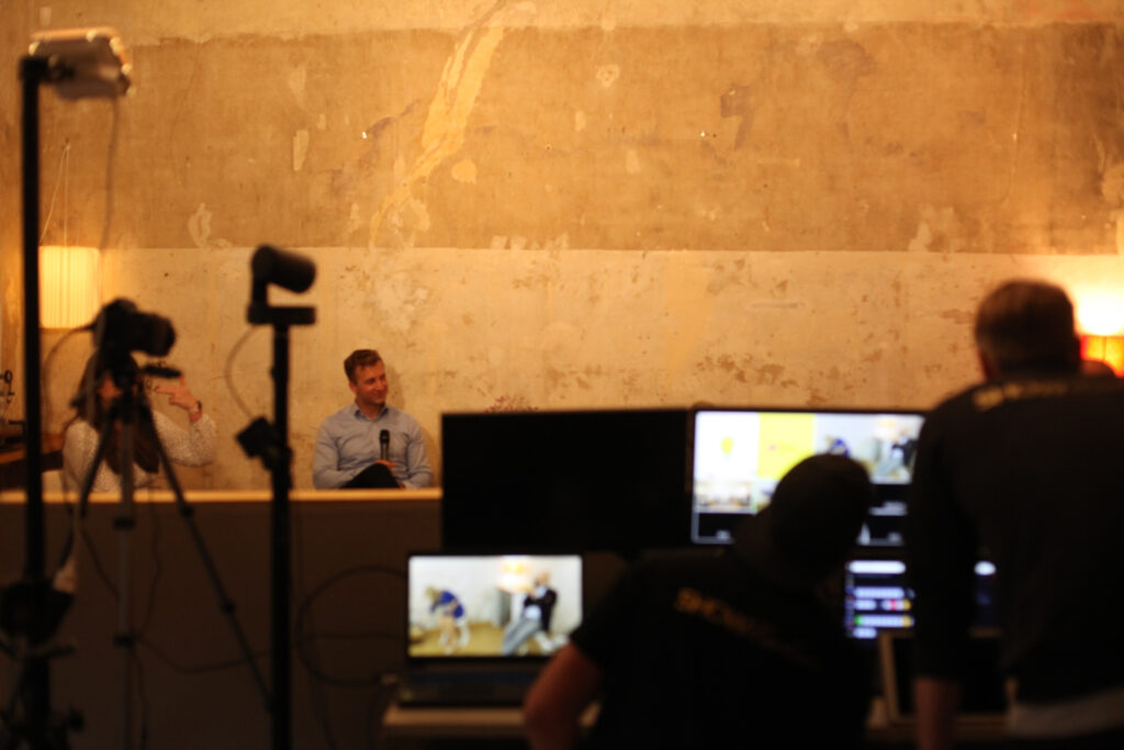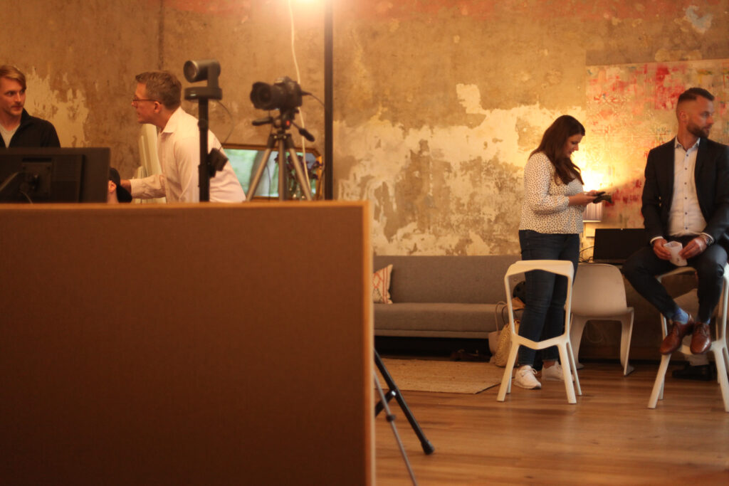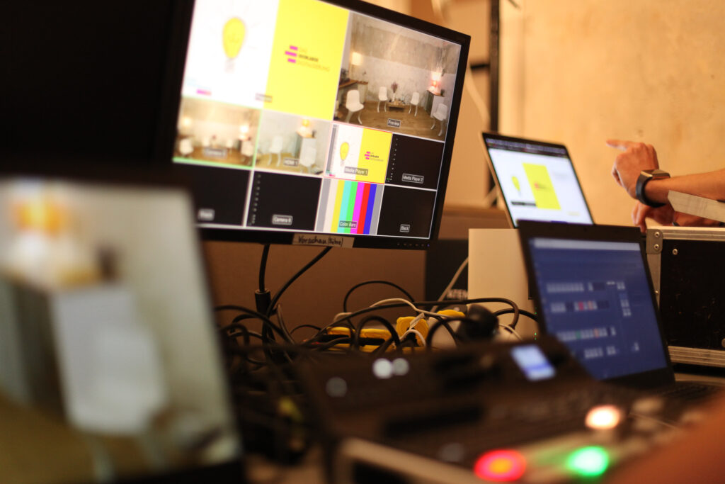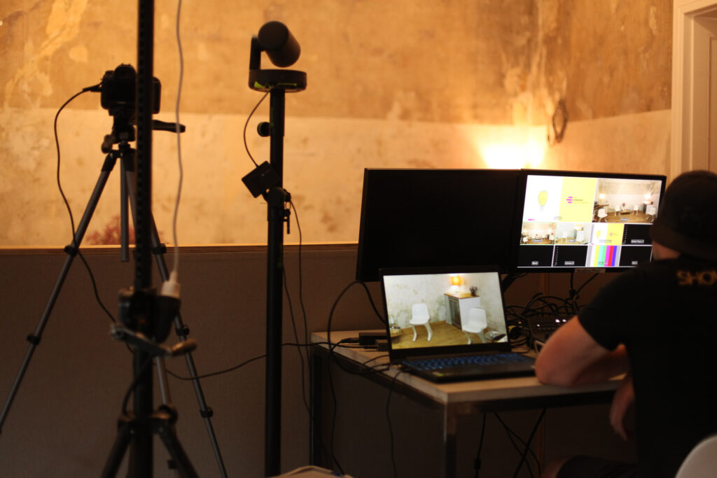 Es ist ein Montagabend. Um 17.00 Uhr ist der Raum wie abgesprochen vorbereitet. Die Technik ist aufgebaut und das Team hat wie immer bei “Sironi” ein paar Focaccias gegessen. Es wird eine Podiumsdiskussion. Der Moderator hat drei Gäste. In der “kleinen Variante” gibt es zwei Kameras und ein Grenzflächenmikrofon für alle. Eine Kamera ist per Fernbedienung schwenkbar, die andere zeigt die Totale. Der Ton und die zwei Bilder wandern in ein “Streamingswitchboard”. Am Switchboard ist ein Monitor, ein Laptop und ein Kopfhörer angeschlossen. Bedient wird das Switchboard von einem Techniker. Er macht eine einfache Bildregie, schaut auf dem stream und hat ein Ohr auf den Ton. Das kleine Publikum im Raum sitzt vor dem großen Samsung Flip hinter der Technik und sieht und hört per Kopfhörer den Livestream.