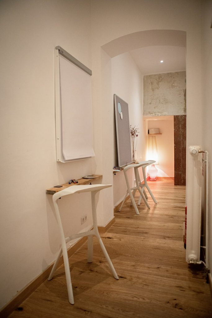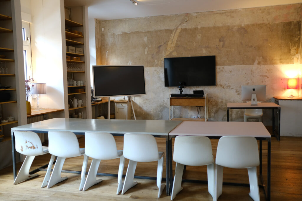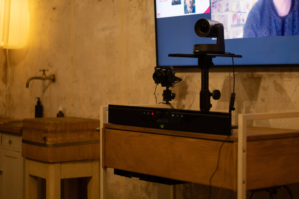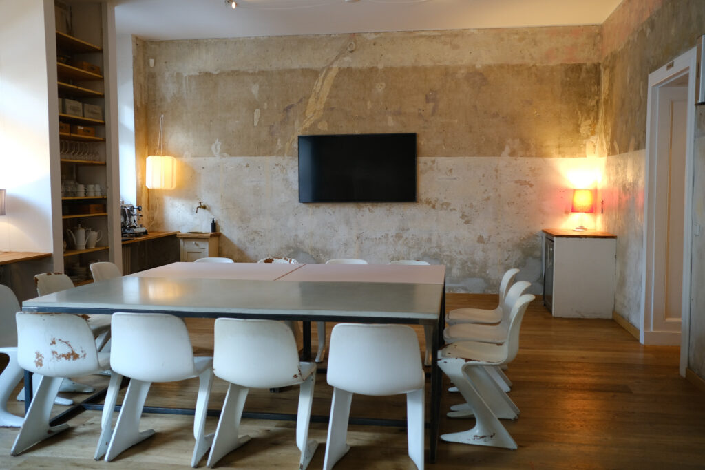 Es ist ein Montagabend. Um 18.00 Uhr ist der Raum wie abgesprochen vorbereitet. Wir rechnen mit 15 Personen. Alle sitzen an einer Tafel. An jedem Platz liegen Papier und ein Stift. Es gibt Wasser und leckeren Apfelsaft aus Brandenburg. An der Wand freut sich der große Monitor auf die Besucher von “anderswo”.  Das Notebook des Verwalters wirft die Agendapunkte an den zweiten Monitor im Raum, den rollbaren Samsung Flip. Die Sitzung beginnt. Einer schreibt fleißig mit. Beim Agendapunkt “Innenhofsanierung” beginnt die kleine Videokonferenz. Der beauftragte Architekt schaltet sich zu und zeigt zwei mögliche Entwürfe. Die gute Logitech Zoom-Kamera vor dem Wandmonitor und das Yamaha Audiosystem machen einen Auge-Augen-Dialog zwischen Architekt und Anwesenden möglich. In der Pause gibt es belegte Baguette vom unserem Lieblingsfranzosen im Kiez und ein Eis vom Späti an der Ecke. Das Whiteboard wird für kleine Zeichnungen benutztUm 22:00 Uhr ist der jährliche Spaß fast vorbei.