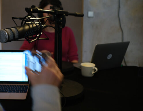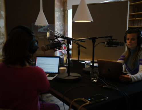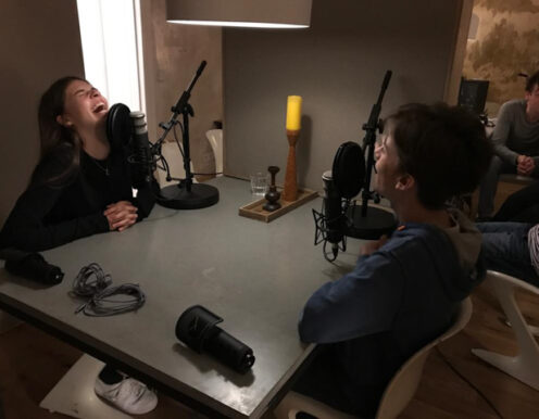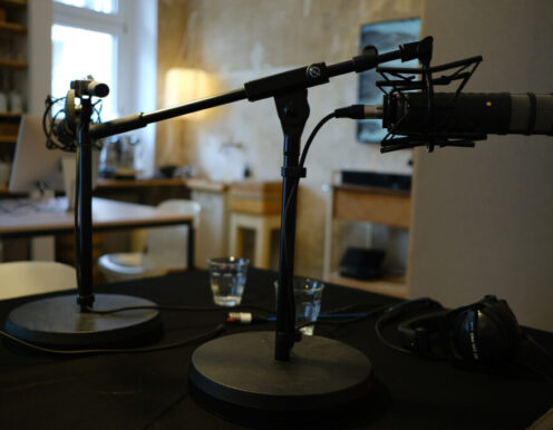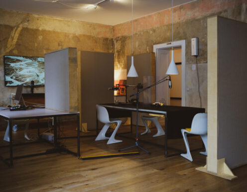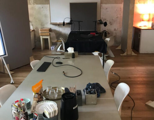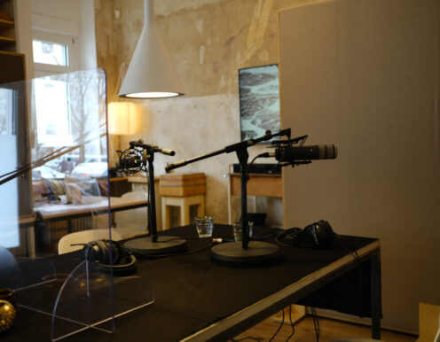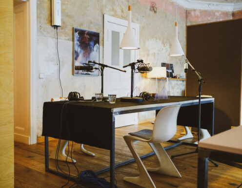 Gerade wenn man zu “mehrt” ist, ist die Atmosphäre doch wichtig! Wir haben die Technik vor Ort. Wir bauen dir mit unseren vier großen Schallabsorberwänden einen kleinen Raum im Raum. Noch ein paar gute Mikros, Kopfhörer, einem Mixer und jede Menge guter Kabel … und fertig ist das schöne Podcast-Studio. Magst du Zuschauer dabei haben? Ein bisschen Stimmung gefällig? Vor Ort ist natürlich Platz dafür. Online zuschalten geht auch – mit unserem Videokonferenzsystem über Zoom und Co. oder über einen VoIP Client für besseren Ton.