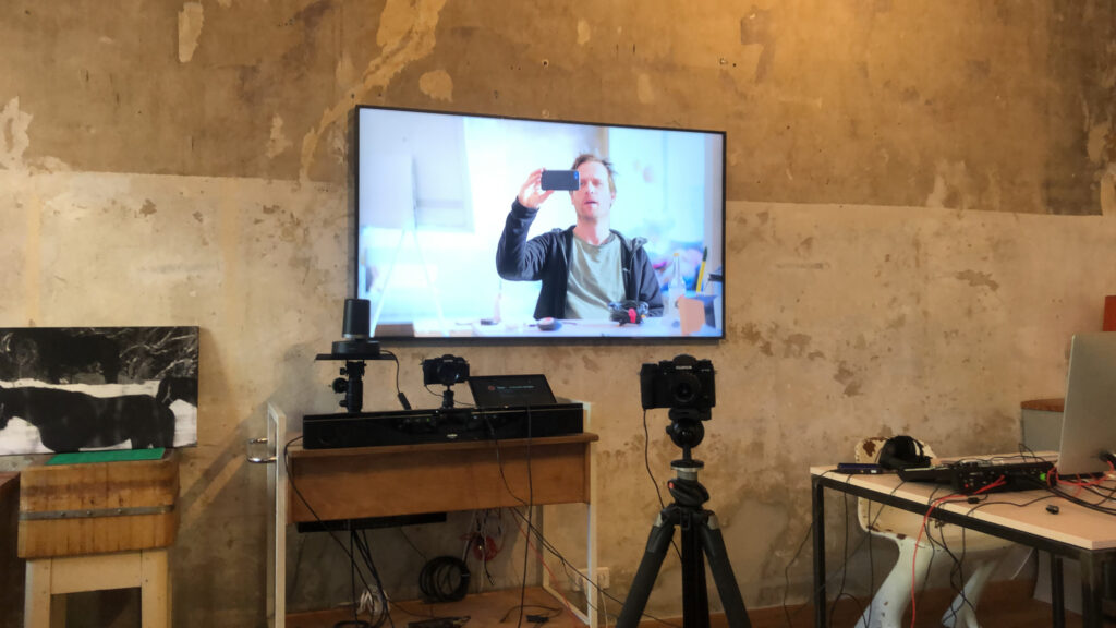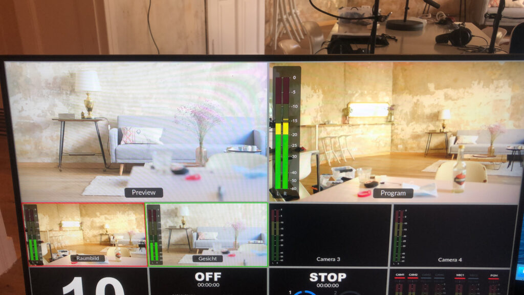 Es ist Samstag vormittag. Um 10.00 Uhr ist der Raum wie abgesprochen vorbereitet. Die Technik ist aufgebaut und wir haben ein paar Croissants von der “Bretagne” für euch übrig gelassen. Heute zeichnet ihr eine besondere Sendung auf: Ihr habt einen Gast vor Ort und ein weiterer ist per Zoom zugeschaltet. Jeder bekommt Mikrofon und Kopfhörer. Unsere erfahrene Technikerin sitzt vor dem Rodecaster Pro Mischpult und sorgt für guten Ton. In der “kleinen Variante” filmen zwei Kameras das Geschehen. Eine filmt die “Totale” und die andere den Gast vor Ort. Der große Wand-TV zeigt den externen Gast per Zoom. Die 3 Bildsignale und das Tonsignal aus dem Rodecaster wandern in das Video-Switchboard, der das ganze entweder Live streamt oder lokal abspeichert. Die Bildregie wird von einem Junior-Techniker gemacht. Er schaut auf das Bild und hat ein weiteres Ohr auf dem Ton. Im Nachgang nimmt sich der Senior die Tonspur mit und mischt den Podcast. Der Junior macht aus der live gemischten Ton- und Videospur einen Film ohne amms und aahs und Wiederholungen. Um 13;00 Uhr ist der Spaß vor Ort vorbei. Meist ist der Pod- und Vodcast fertig gemischt innerhalb von 36 h auf euren Smartphones ….